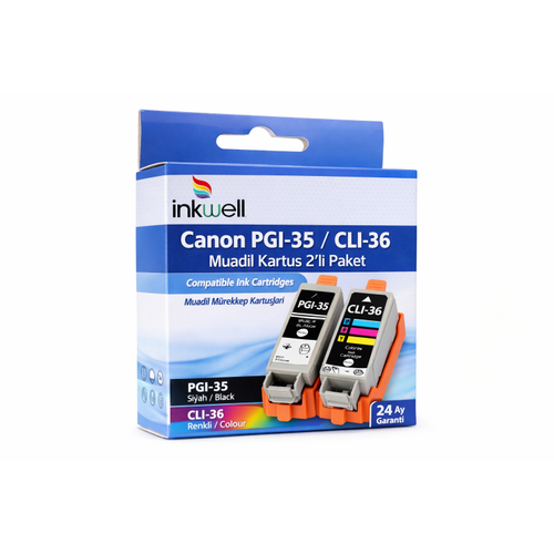 Canon PGI-35 / CLI-36 2'li Paket Muadil Kartuş, Canon PIXMA serisi yazıcılar için ekonomik ve yüksek performanslı baskı çözümüdür. Paket içeriğinde 1 adet PGI-35 Siyah ve 1 adet CLI-36 Renkli (Cyan / Magenta / Yellow) muadil kartuş bulunmaktadır.