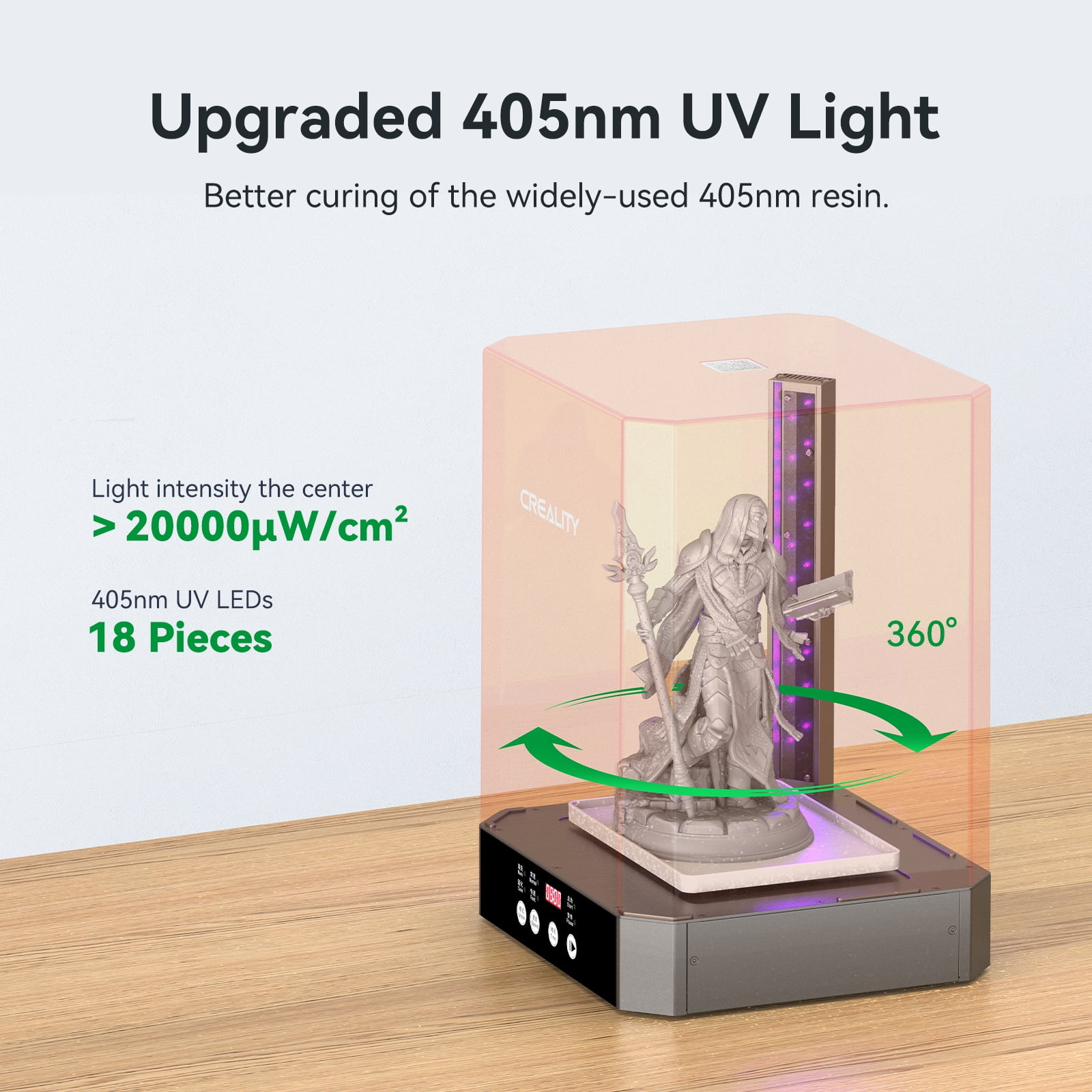 • ? 360° Otomatik Kürleme: Döner tabla ve 405nm UV LED dizilimi ile tüm yüzeyler eşit şekilde kürlenir.